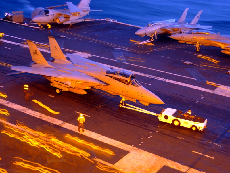 F-14D TomcatAn F-14D Tomcat is towed across the flight deck aboard the Nimitz-class aircraft carrier USS Theodore Roosevelt (CVN 71) after a day of flight operations. (U.S. Navy photo) 1024 x 768 | 800 x 600 |