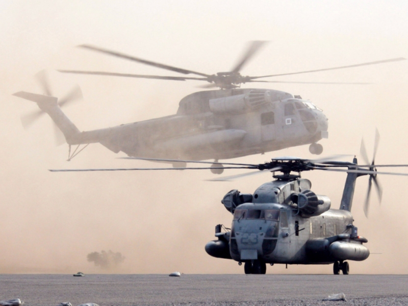 CH-53D Sea StallionsTwo CH-53D Sea Stallions land in the waiting area of the Forward Arming and Refueling Point while training during Exercise Desert Talon at Marine Corps Air Station Yuma. (USMC photo by Cpl. Jonathan K. Teslevich) 1152 x 864 | 1024 x 768 | 800 x 600 |