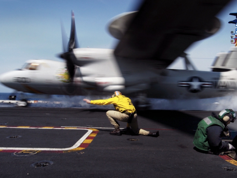 E-2C Hawkey Launches From USS Kitty HawkA catapult shooter launches an E-2C Hawkeye, assigned to the "Liberty Bells" of Carrier Airborne Early Warning Squadron One One Five (VAW-115), from the flight deck aboard USS Kitty Hawk (CV 63). (U.S. Navy photo by Photographer’s Mate 3rd Class Bo Flannigan) 1024 x 768 | 800 x 600 |