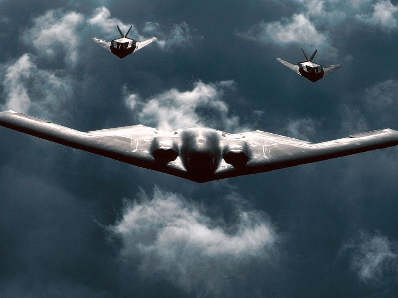 F-117s Escort B-2 SpiritA B-2 Spirit bomber is followed by two F-117 Nighthawks during a mission. The B-2 is a multi-role bomber capable of delivering both conventional and nuclear munitions. (U.S. Air Force photo) 1152 x 864 | 1024 x 768 | 800 x 600 |