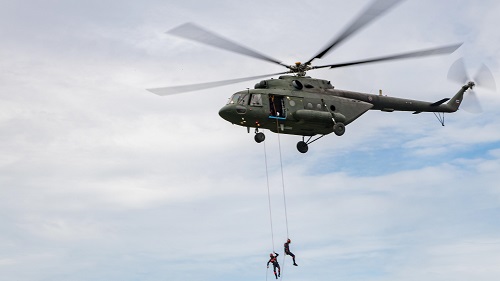 Helicopters from Japan, Russia, Singapore and Thailand roared toward the airfield, dispatching fast-rope rescue teams and airlifting casualties. Meanwhile, teams on the ground moved casualties from the “hot zone,” a simulated collapsing building, to the “warm zone,” the immediate safety of an open field, and triaged according to casualty condition.