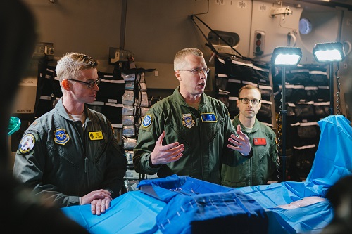 While touring the C-17 static display, congressional staff members also spoke with aeromedical evacuation teams from the 459th Aeromedical Evacuation Squadron here and the 43rd AES from Seymour-Johnson AFB, North Carolina, and received a firsthand look at AMC’s aeromedical evacuation mission.
