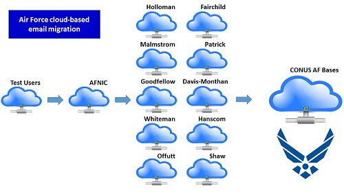 Email is the first of the Microsoft Office 365 services the Air Force is migrating to a cloud-based service. An initial test began with AFNIC last year and the team recently completed migrating the first full Air Force base.