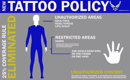 A recent review of Air Force field recruiters revealed almost half of contacts, applicants and recruits had tattoos. Of these, one of every five were found to have tattoos requiring review or that may be considered disqualifying; the top disqualifier was the 25 percent rule on “excessive” tattoos. The new policy lifts the 25 percent restriction on authorized tattoos to the chest, back, arms and legs, opening up this population for recruitment into the Air Force.