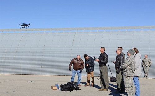 The winds remained manageable and allowed the test team to conduct three sorties with the quadcopter, which was fitted with a video camera. Live video was assessed by the team that included maintainers, to determine if the quality was adequate for routine inspections. The video recorded from the quadcopter’s camera will be analyzed to see if it is clear enough to see smaller details of the cargo plane’s exterior such as structural abnormalities, rivets and cracks.