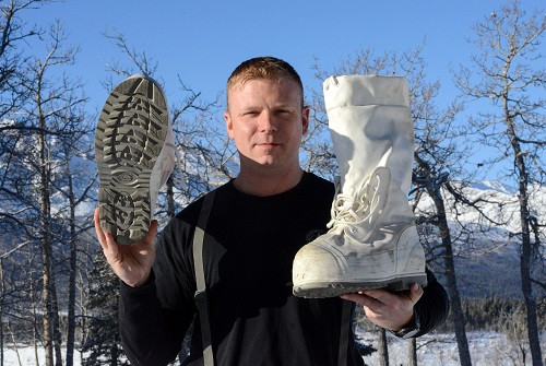 Spc. Elijah Mainini, a student, is one such Soldier who was issued Mutluks and Jager skis because his feet are too large for VB boots. He wears a size 16 boot.