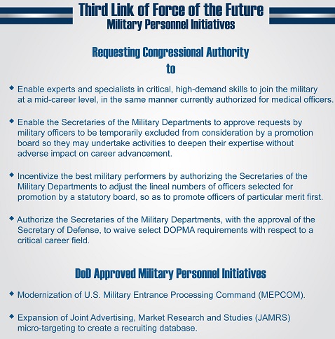 For the third link, the DOD will work to ensure that the military continues to be as ready to meet the challenges of the future as it is to meet the challenges of today. This includes six proposals or changes for additional military services flexibility in certain aspects of the military personnel management system that would do the following:
