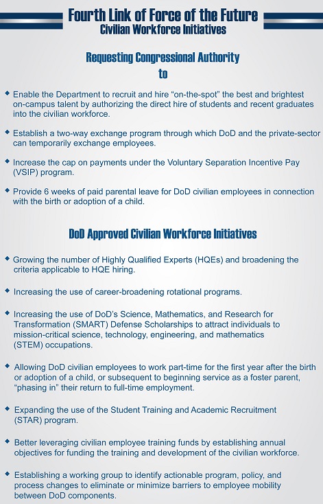 The fourth link provides civilian workforce initiatives designed to extend the advantage civil servants provide the DOD and leverage the department’s unique mission to encourage and incentivize public service, streamlining the path to DOD employment and maximizing talent. The following proposals and implementations in many ways propose programs parallel to those available to military personnel.