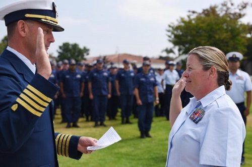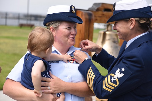 AUGUST 8, 2017 – Standing in front of her peers and surrounded by her family, Chief Petty Officer Crystal Martens, a gunner’s mate, shows no signs of unease as she prepares to take another step forward for women in the Coast Guard. She waits patiently; smiling occasionally, showing hints of joy that only comes from a loving mother holding her young daughter.