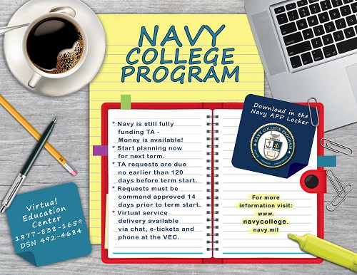 “Two of the questions we get asked most often are ‘How do I get started with my education?’ and ‘How do I pay for it?’,” said Naval Education and Training Professional Development Center Voluntary Education (VOLED) Program Director Ernest D’Antonio. “The answers are easy. 1) Start with the Navy College Program (NCP) website or Virtual Education Center (VEC), and 2) Talk with your Navy College Education Counselor to ensure TA eligibility and 3) Apply.”