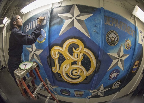 MARCH 20, 2017, ATLANTIC OCEAN (NNS) – A long-lasting tradition in the Navy is to color over the gray and decorate bulkheads with colorful artwork that expresses pride in the ship the artist is attached to.