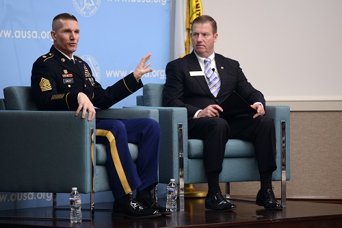 Dailey spoke during a morning breakfast discussion hosted by the Association of the U.S. Army Tuesday. During the breakfast, Dailey, who now serves as the 15th sergeant major of the Army, discussed current Army topics with retired Sergeant Major of the Army Kenneth O. Preston.