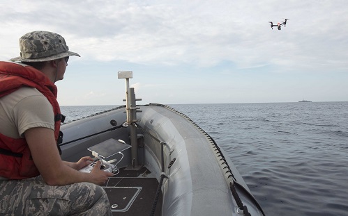 Air Force cadets from the U.S. Air Force Academy operated UASs from Jason Dunham’s rigid hull inflatable boat about two nautical miles away from Jason Dunham, providing an opportunity for the cadets to test the UASs in a maritime environment and allowing Jason Dunham opportunities to test sensor and tracking systems from different ranges and elevations.