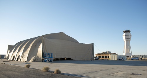 The decontamination shelter takes about four weeks to construct and is nearly complete. It consists of four components. The first is an external air beam shelter, which protects an inner structure — the aircraft enclosure. The tent is there to protect the enclosure from the elements such as wind loads, solar loads and everything else the desert climate will present throughout the system’s roughly six-month tour here. The aircraft enclosure allows the plane to be simultaneously decontaminated externally and internally within walls made up of insulated panels.