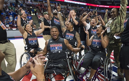 JULY 11, 2017, CHICAGO – Medically retired Army Sgt. Jhoonar Barrera sank a free throw with 23.5 seconds remaining on the clock to seal a 56-55 Army victory over Navy in the wheelchair basketball final at the United Center here Friday during the 2017 Department of Defense Warrior Games.