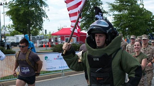 Glenn ran the half marathon in a full EOD bomb suit, an added weight of 85 pounds, to help raise money for the EOD Warrior Foundation. This is Glenn’s second race he has completed wearing his bomb suit helping him raise nearly $25,000 for the foundation.