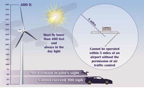 In 2015, the FAA released rules for hobbyists operating UAVs. Drones must be operated within sight of the remote pilot during daylight hours. This rule allows for corrective lenses worn by the pilot, but not the cameras on the craft itself. The aircraft cannot fly higher than 400 feet in altitude and must be operated at less than 100 mph. They have to give way to all other aircraft and local air traffic control must be notified when UAVs are operated within 5 miles of an airport.