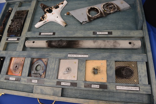 Katner also pointed out that a laser beam can also be scaled to the object in question, as he showcased a display of items that were hit by a laser. The objects included steel plating, aluminum, copper, carbon fiber and Kevlar. Other display items included a fried circuit board, a destroyed fixed-wing UAV and quadcopter, all victims of the laser beam.