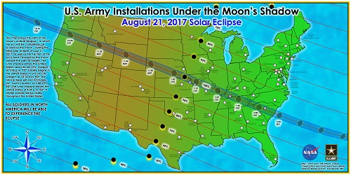 Several Regular Army installations, including Fort Jackson, South Carolina; Fort Campbell, Kentucky; Fort Leavenworth, Kansas; and Fort Leonard Wood, Missouri are in or very near that path of totality. Many other Army National Guard readiness centers and armories, as well as Army arsenals and depots, will also be able to experience the “total eclipse.”