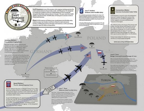 Exercise Swift Response 2016 (SR16) is one of the premier military crisis response training events for multinational airborne forces in the world and takes place in Poland and Germany, May 27-June 24.