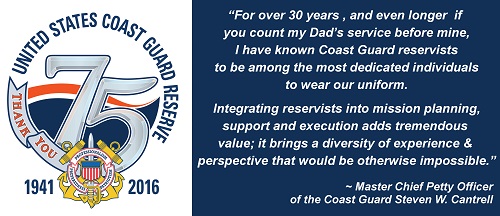 February 19, 2016, by Petty Officer 2nd Class Sara A. Romero – Today marks the diamond anniversary for the Coast Guard Reserve, founded on Feb. 19, as part of the Auxiliary and Reserve Act of 1941. For 75 years Coast Guard Reserve members have served along side the active duty force in every major conflict, or crisis, this nation has faced.
