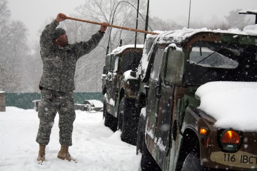 – Virginia National Guard Soldiers working in support of Waynesboro Fire and Rescue responded along with an ambulance to an emergency call on Afton Mountain Jan. 24. The resident was located about one mile from the main cleared road, but the ambulance and rescue teams were not able to reach the house. The Guard Humvee with one EMT was able to move through the unplowed road and clear a path for a follow on vehicle to pick up the resident for movement to an air evacuation site.